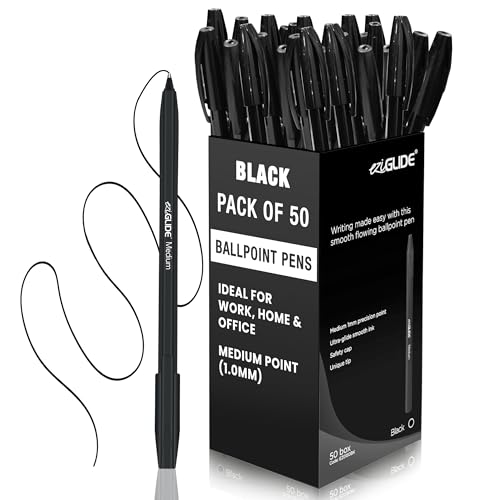 Eziglide Ballpoint Pens Black Ink 50-Pack – Black Biro Pens Multipack with Medium Point (1.0mm) for Effortless, Smooth Handwriting & Consistent Flow – Black Pens for School, Home, Office Supplies