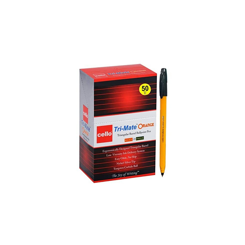 Cello Tri-Mate Orange Ballpoint Pens Medium Point Biro, Black Pens Pack of 50 Smooth Writing