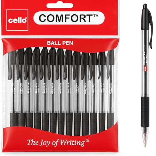 Cello Comfort Ballpoint Pens - Premium Retractable Biro Pens with Ergonomic Grip, Medium Point 1.0mm, Black Ink, Pack of 12 - Ideal for Office, School & Home Writing