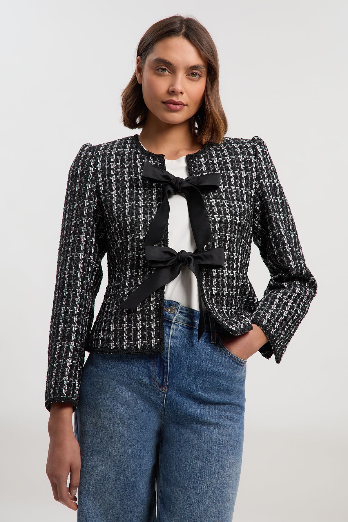 Karen Millen Womens Boucle Tailored Bow Detail Peplum Jacket - Black - Size 16 UK