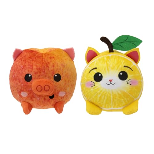 FOODIBLES Lemon Cat & Peach Pig soft cuddly plush toys, these stuffed animal twin packs are 10cms tall teddy bear, Yellow