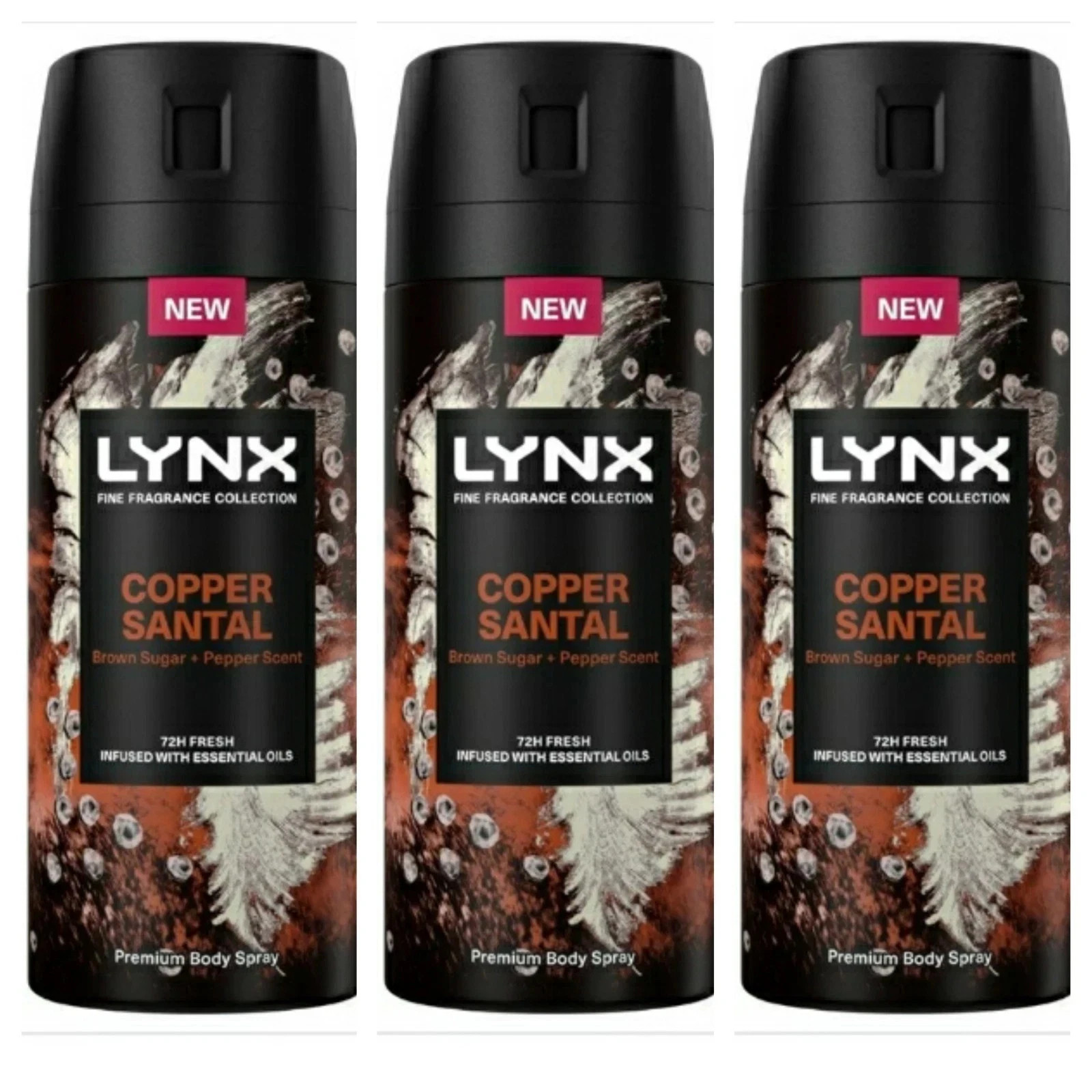 3 X LYNX COPPER SANTAL BROWN SUGAR & PEPPER FRAGRANCE PREMIUM BODY SPRAY 150ML