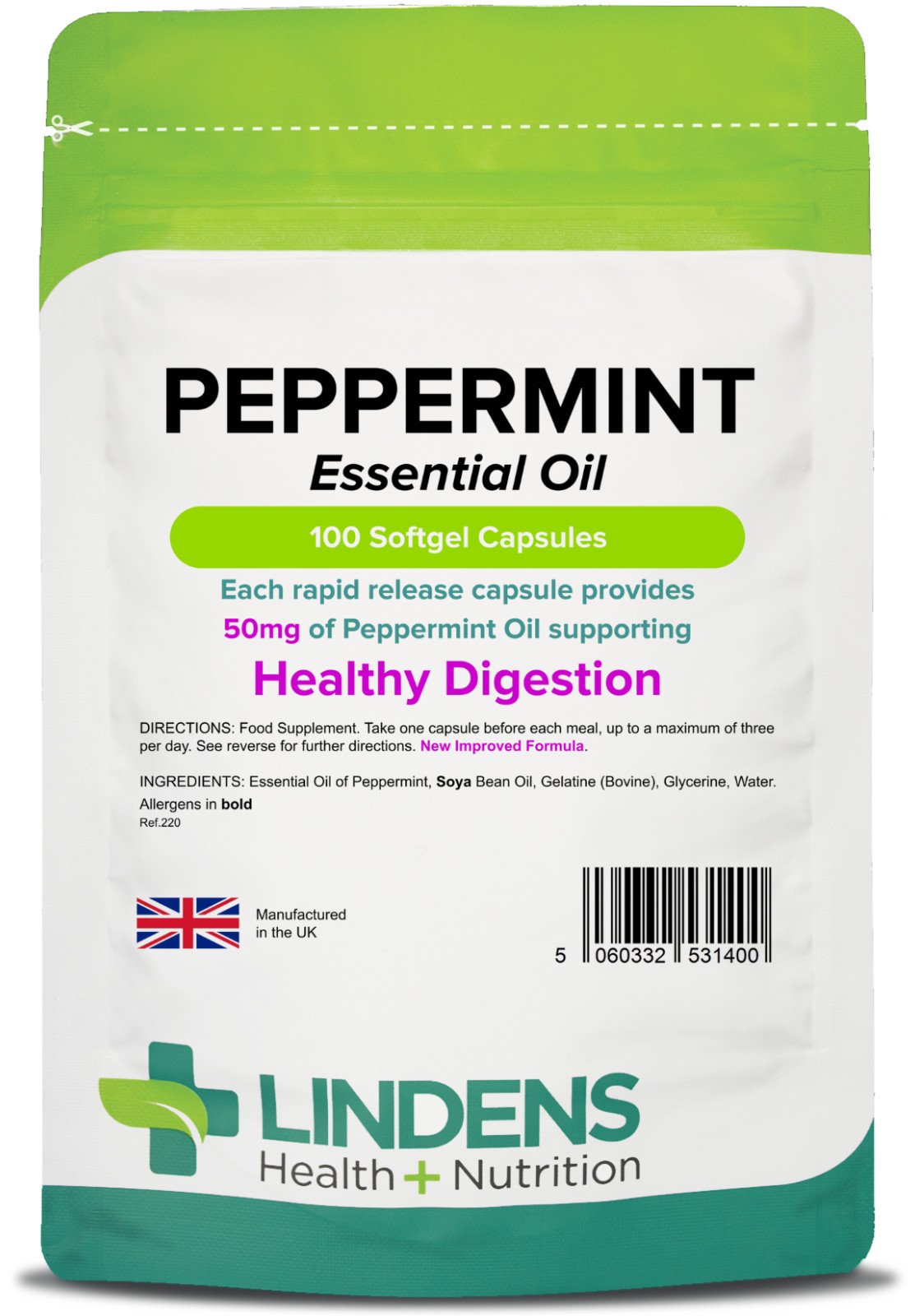 Lindens - Peppermint Oil 50mg Capsules - 100 Pack - UK Made - Essential Oil of Peppermint Supporting Healthy Digestion - Letterbox Friendly