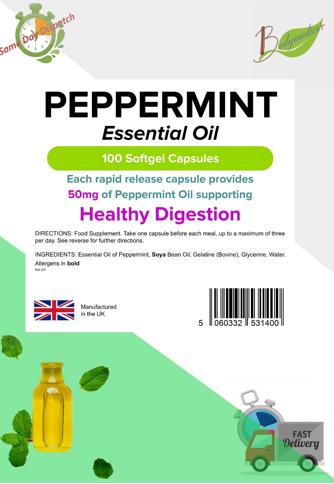 Peppermint Oil 50mg - 180 Capsules - Natural Stomach Gastric Aid, Heartburn, UK