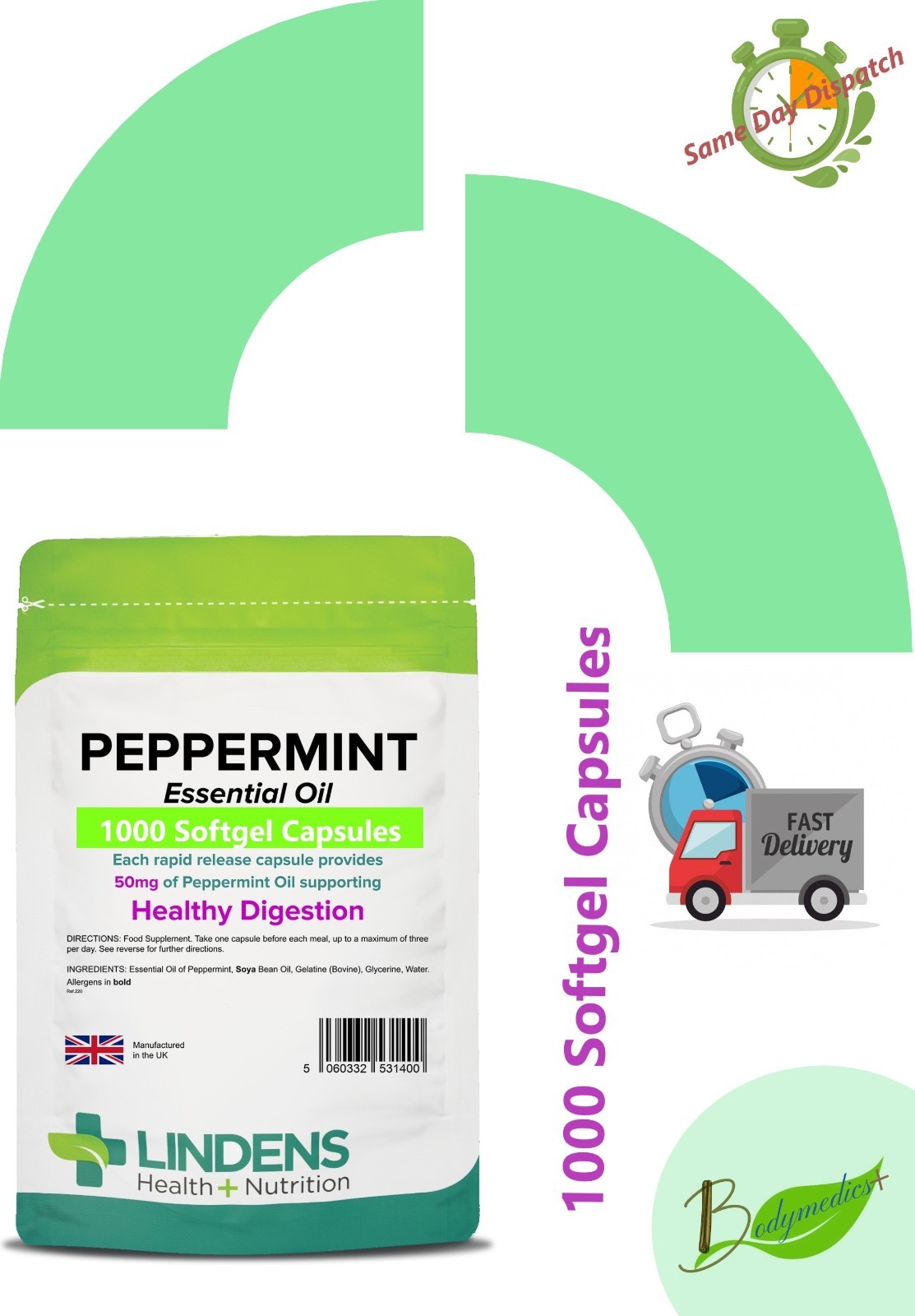 Peppermint Oil Capsules 50mg, (1000 Soft Gel) Essential Oil Digestion LINDENS UK
