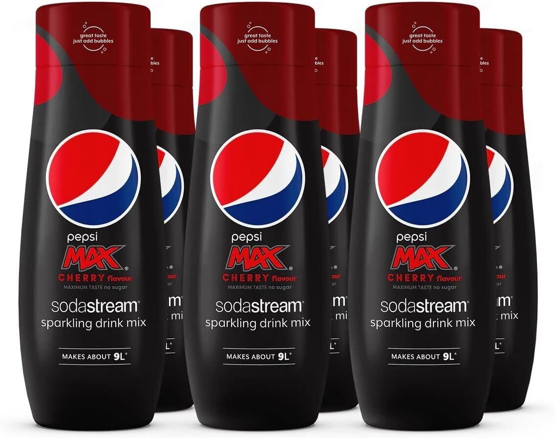 SodaStream Pepsi MAX Cherry Fizzy Water Flavouring Syrup, Sugar Free Soda Syrup, Zero Sugar Pepsi Flavour, 6 x 440ml Multipack, Home Soda, Flavoured Sparkling Water, Drink Mix, Makes Approx 54L