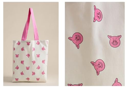 London Food Hall M&S Tote Bag with Percy Pig Pattern, White Canvas with Pink Handles, Reusable Shopping Bag