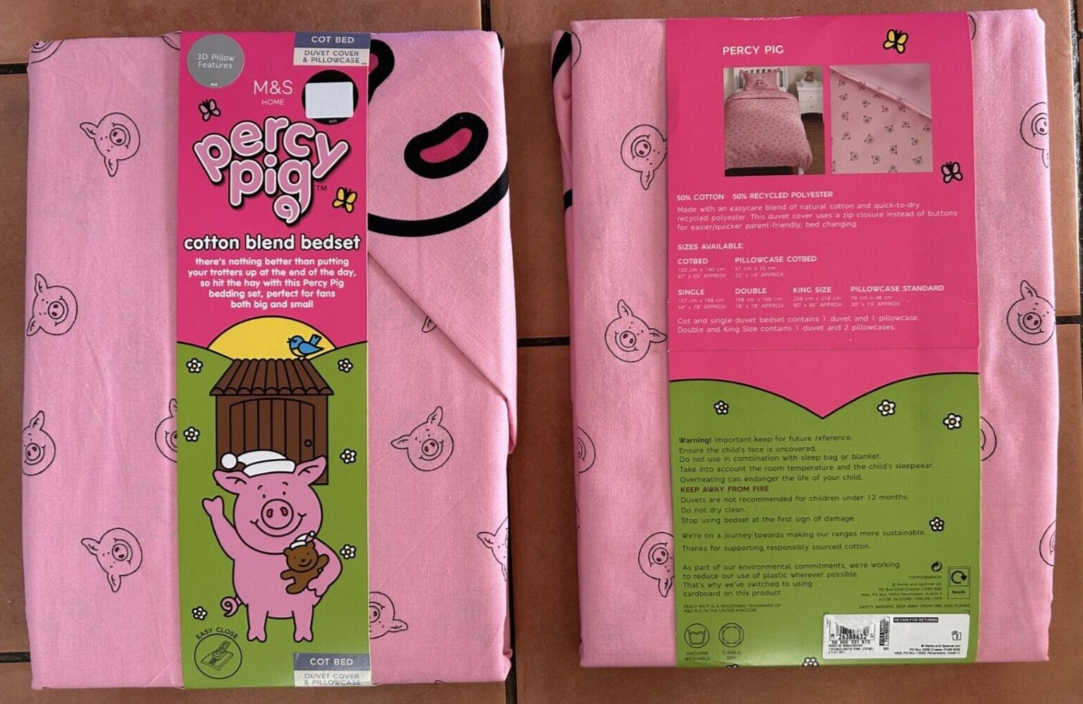 M & S Percy Pig Cot Bed Duvet Cover + Pillowcase Set -new in pkt