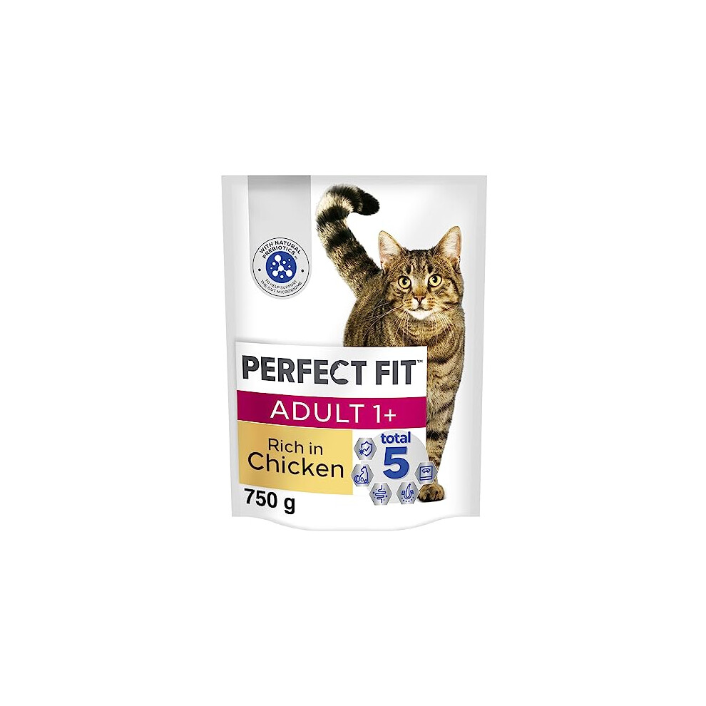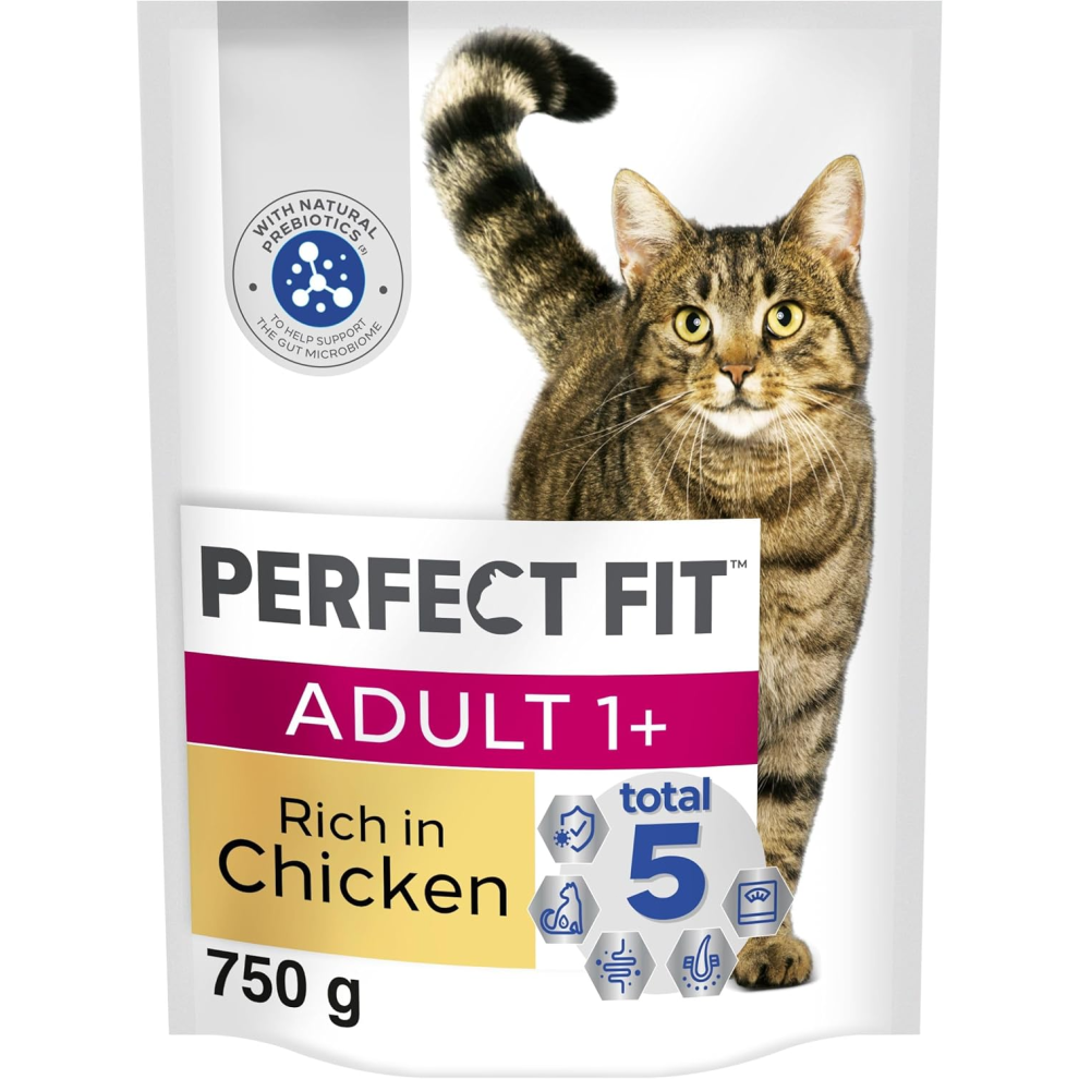 Perfect Fit Adult 1+ Complete Dry Cat Food for Adult Cats Aged 1+ Years, Rich in Chicken, 4 Bags (750 g)