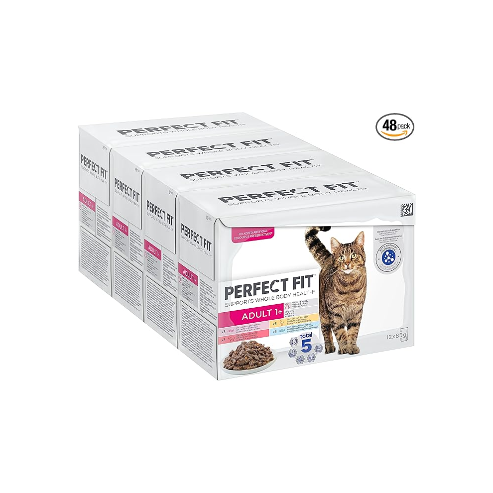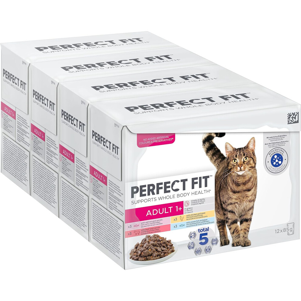 Perfect Fit 1+ Adult Mixed Selection in Sauce 48 Pouches, Complete Premium Wet Cat Food, Pack of 4 (12 x 85 g)