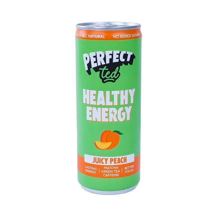 PerfectTed Juicy Peach Healthy Energy Drink, 12 x 250ml Cans, All-Natural Green Tea Caffeine (80mg) & L-Theanine | Low Calorie (43KCAL) | Vegan | Gluten-Free | No Added Sugar