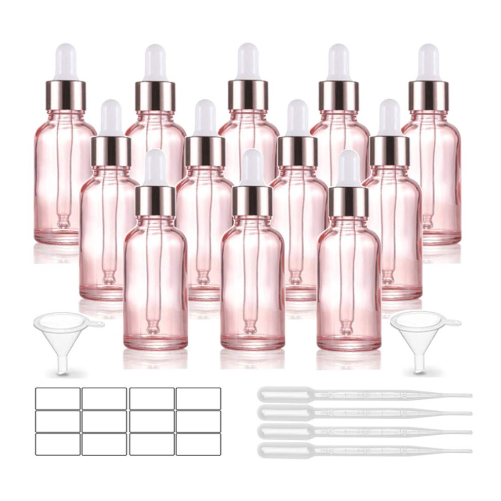 12 Pack 1 Oz Pink Dropper Bottle for Essential Oils Empty Glass Eye Dropper Bottle Holder With Glass Pipette Rose-Golden Caps Perfume Travel Vial C