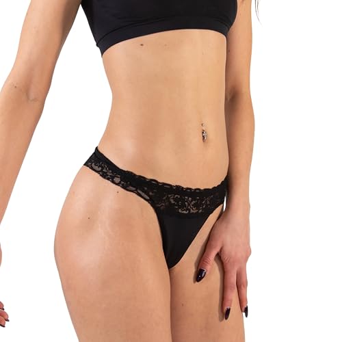 HEMSLEY Period Thong underwear for Women – Absorbent, Leakproof, Seamless & Eco-Friendly Reusable Underwear Lace detail, Light Flow/Spotting - UK Size 6 to 18 (Including Plus Size) Black