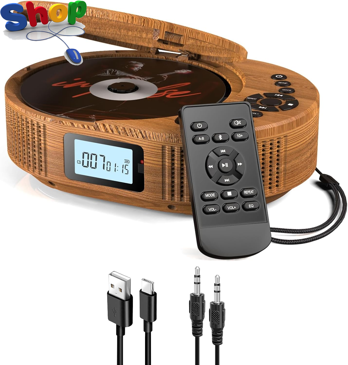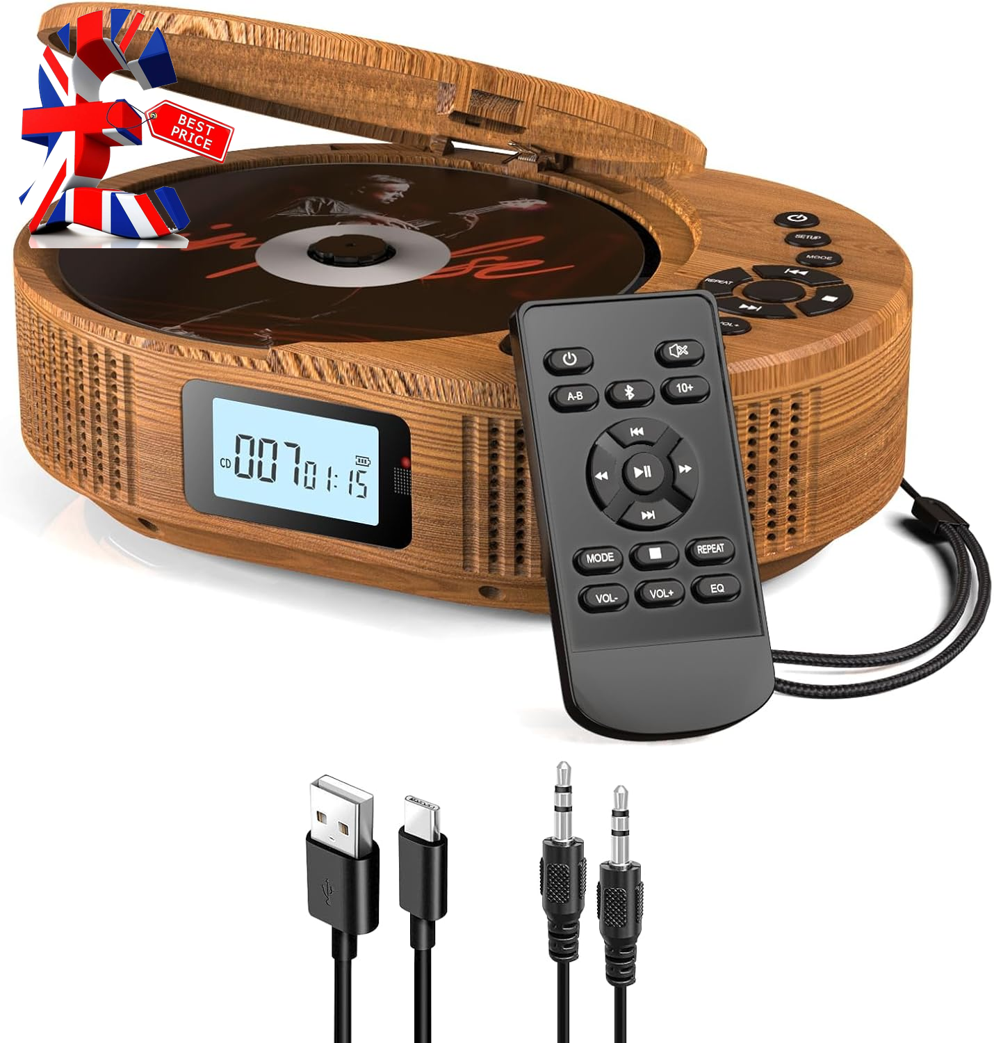 Portable cd player with bluetooth, FELEMAN personal cd player with speakers/rechargeable battery/display/headphones, Car cd player with AUX cable, can insert TF card