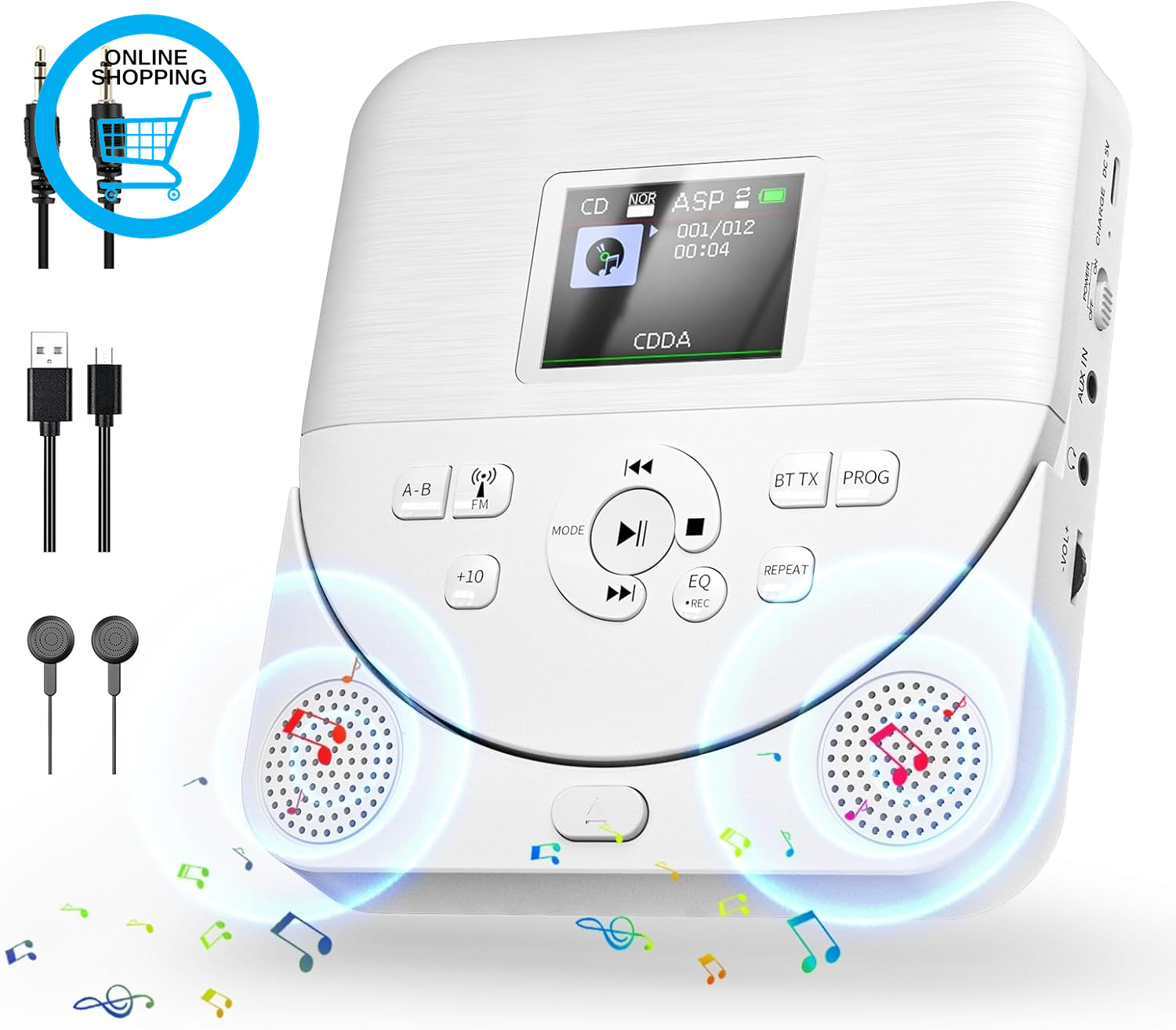 August SE10W Portable Rechargeable CD Player for Home, Car & Travel – Personal Discman MP3 Music Player with Earphones, LCD Display, EQ & Anti-Shock, Disc/Micro SD Support, 15H Playback – White