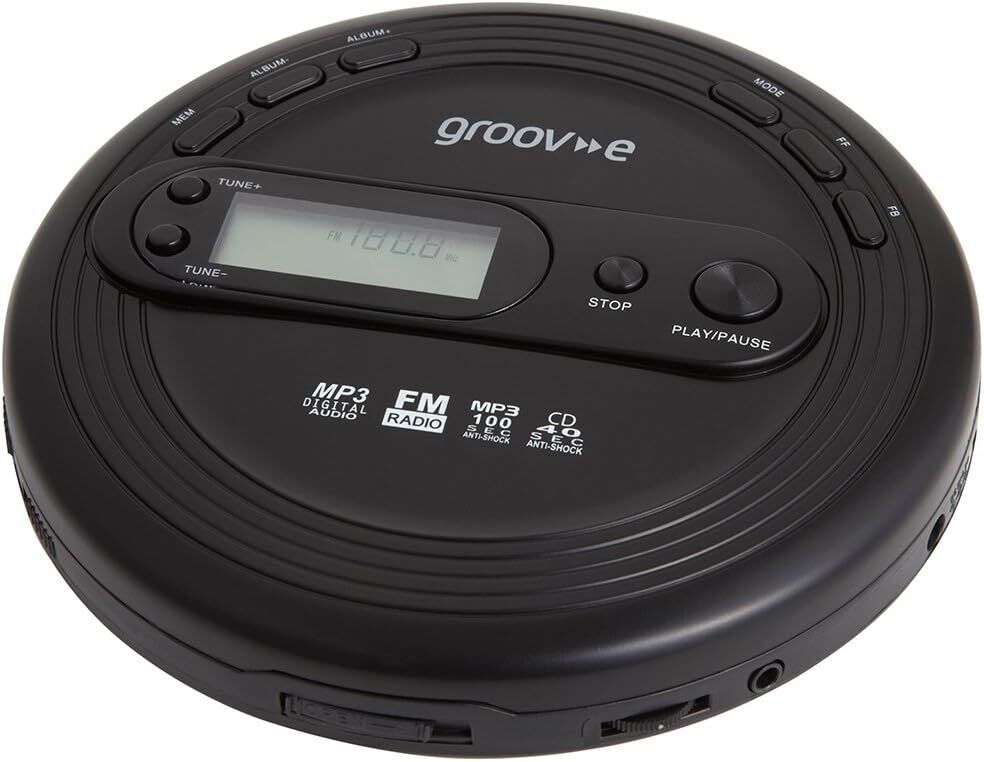 groov e RETRO Radio CD Player - Personal FM Radio with CD-R, CD-RW, & MP3 Music Playback - Anti-Skip Protection, Programmable Tracks - Earphones Included - Micro-USB or Battery Powered - Black