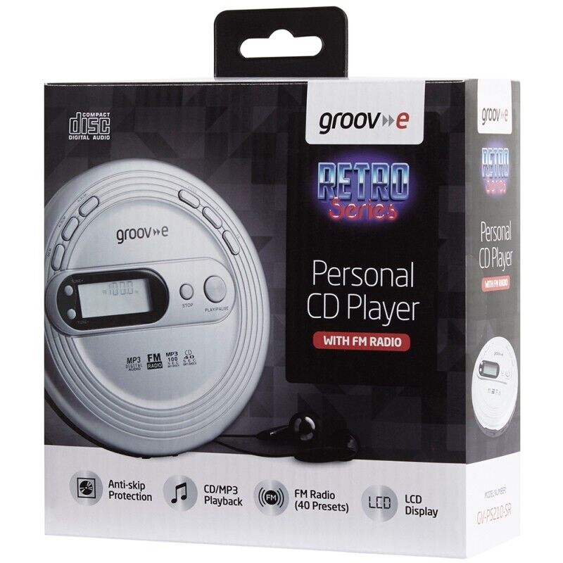 groov e RETRO Compact CD Player - Personal Music Player with CD-R & CD-RW Playback - Anti-Skip Protection, Programmable Tracks - Earphones Included - Micro-USB or Battery Powered - Silver