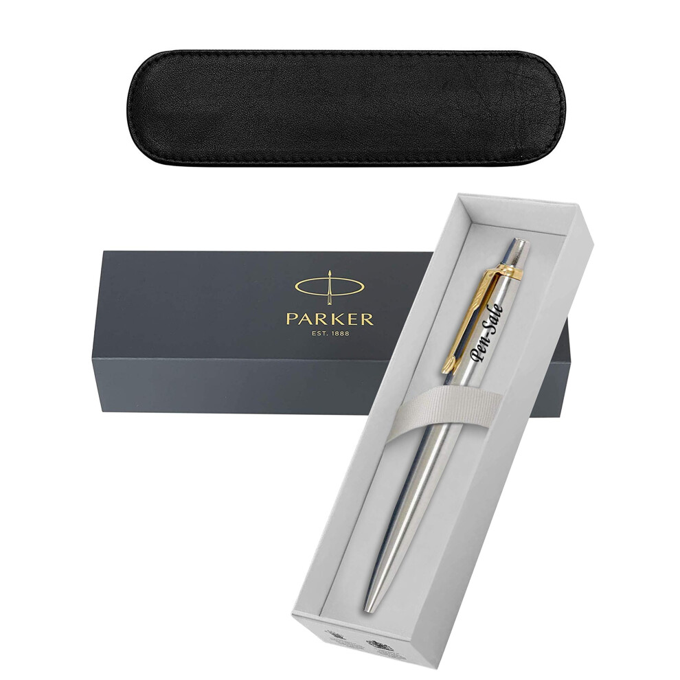 Personalised Engraved Parker Jotter Stainless Steel Gold Trim Black Ink Ballpoint Pen Gift Boxed with a Classy Leather Pen Slip - Enter Your Custom
