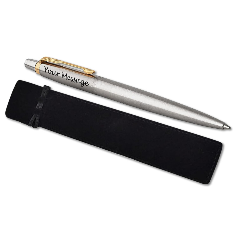 Personalised Engraved Premium Parker Stainless Steel Gold or Silver Trim Ballpoint Pen with Black Ink, Classy Gift Box and gift bag Custom Gift for Christmas, for Men and Women Enter Your Custom Text
