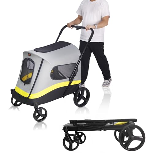 BingoPaw Folding Extra Large Dog Stroller : Portable Dog Buggy 4 Wheels for Large Dogs Pet Cat Travel Carriage Stroller Breathable Carrier with Rain Cover Include