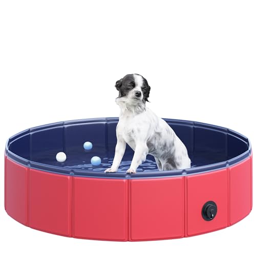 PawHut Foldable Dog Paddling Pool Pet Cat Swimming Pool Indoor/Outdoor Collapsible Summer Bathing Tub Shower Tub Puppy (80w × 20h cm, Red)