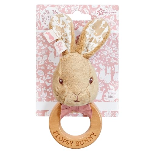 Rainbow Designs Flopsy Bunny Wooden Ring Rattle - Peter Rabbit and Friends Baby Teething Toy with Soft Chime - Sustainable Wood and Plush Fabric