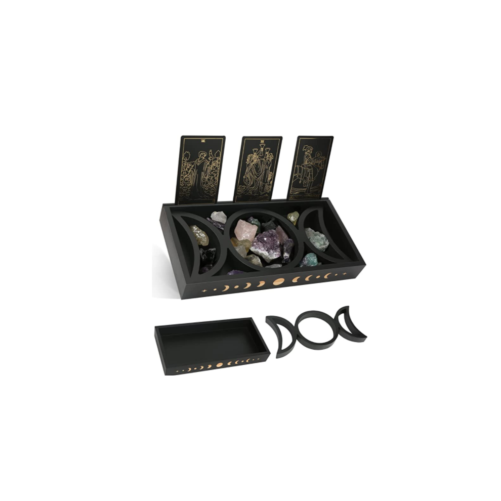 Tarot Card Stand & Crystal Display, Triple Moon Gemstone Organizer, Wooden Box With Lunar Phase Pattern, Elegant Organizer For Jewelry & Essential Oil