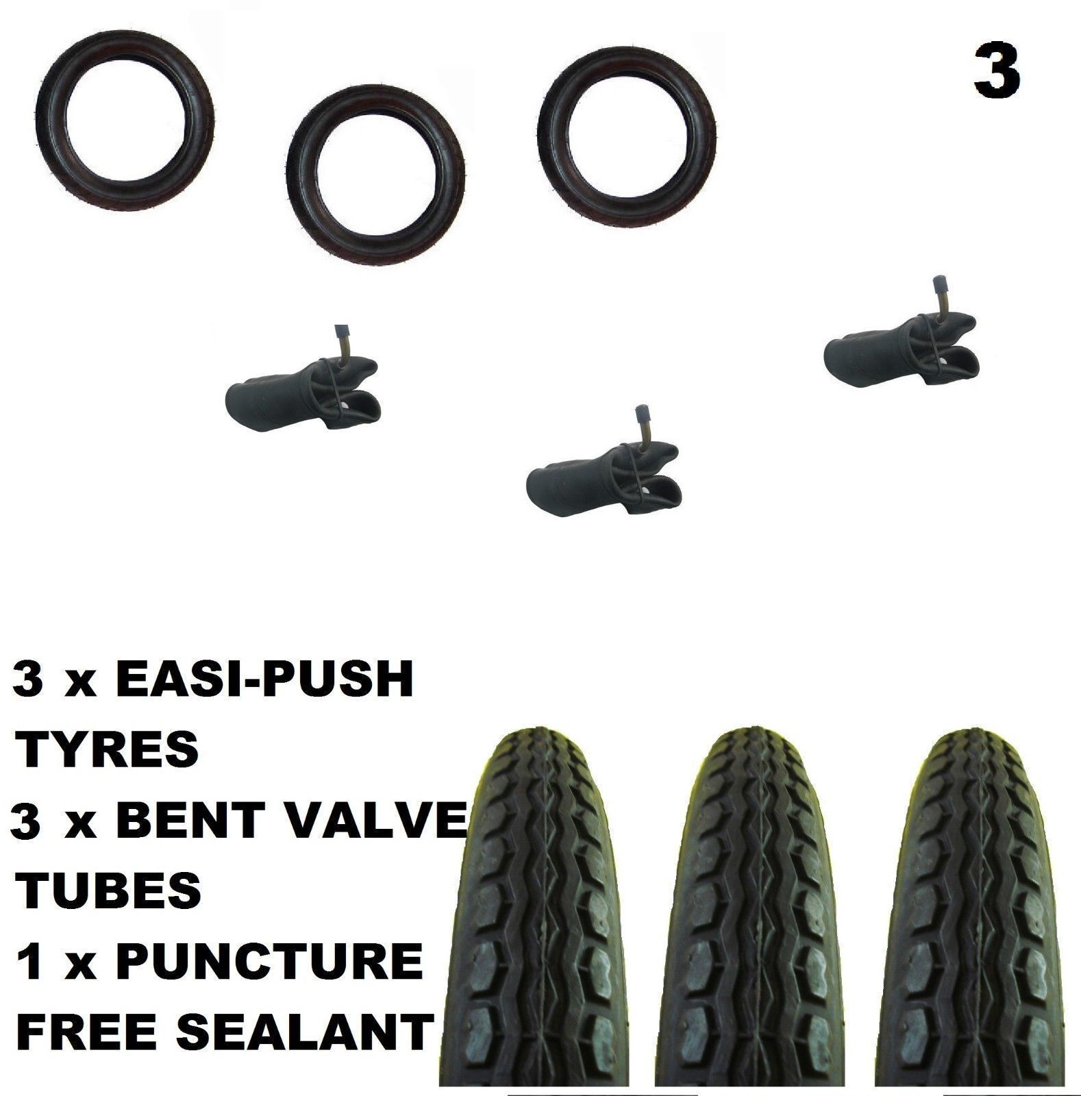 3 x Phil and Teds E3 PRAM TYRES 12 1/2" x 2 1/4 + Bent tubes + Puncture Sealant