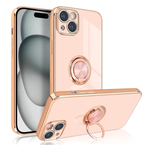 Electroplated Magnetic Case for iPhone 15 Plus, 360 Degree Rotation Finger Ring Holder Phone Case Magnet Car Stand Soft Silicone Shockproof Protective Bumper Cover for iPhone 15 Plus-Beige