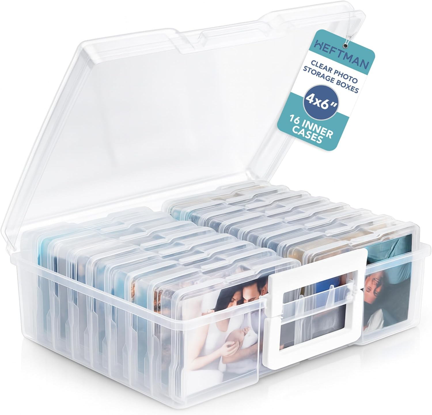 HEFTMAN 4 x 6 Photo Storage Boxes - Clear Photo Storage Box with 16 Inner Photo Cases, Holds 1600 Photos- Transparent Seed Storage Box Organiser for Photos, Office Supplies, Cables, Stickers (4 x 6)