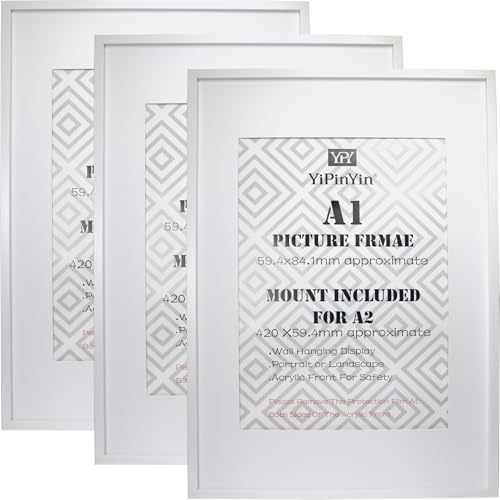 White A1(59.4x84.1cm) Boxed Picture Frames Set of 3 with Mounts for A2 Photos - Elegant Wall Gallery Frames for Home, Bedroom Living Room,Office & Hotel Decor