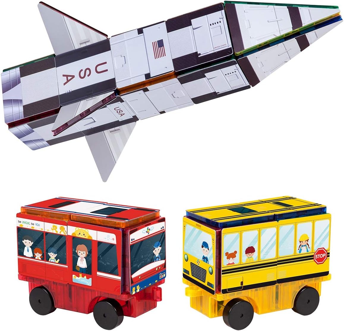 PicassoTiles Magnet Building Blocks STEM Learning Construction Toy Set Early Education Kit 3-in-1 Rocket, School Bus, Train Theme Stick-On Puzzle Pretend Play Magnetic Tiles Kids Building Block Toys