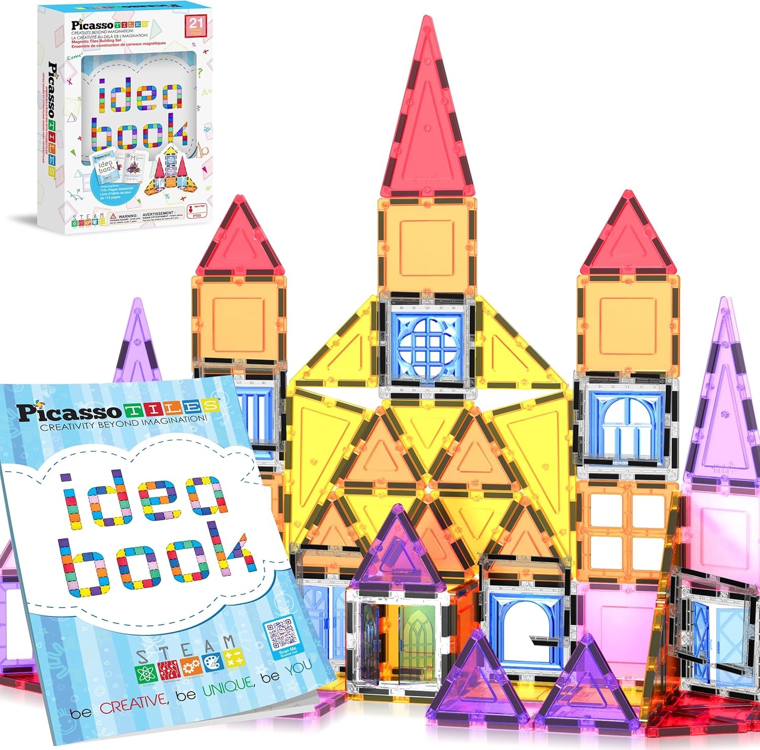 PicassoTiles Magnetic Tiles Magnet Tile Building Blocks Construction Set with 110+ Page IdeaBook Included STEM Learning Toys Toddlers Educational Fun Pretend Play Kids Boys Girls Sensory Toys Ages 3+