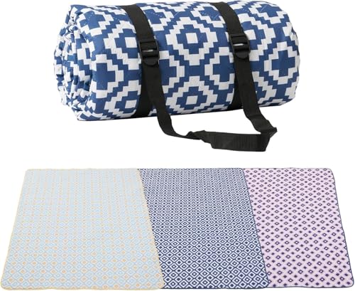Picnic Blankets PortableAnd Aterproof Sandproof Foldable Outdoor Blanket Handy Mat Tote(Blue White Straps)