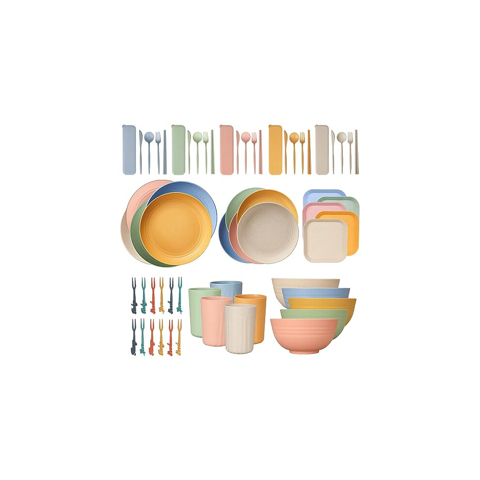 48pcs Unbreakable Dinnerware Sets for 4 People, Camping/Picnic Dinner Sets, Lightweight Colorful BBQ Plastic Serving Plates, Bowls, Cups,Cutlery Set,