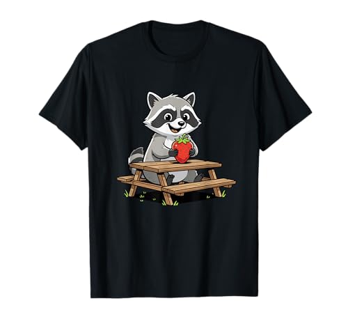Kawaii Raccoon Eating Strawberry at Picnic Table T-Shirt