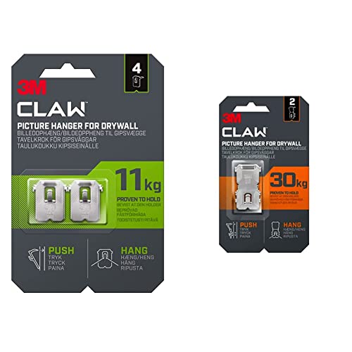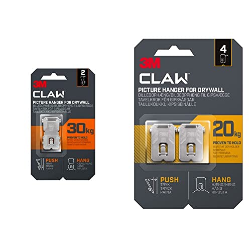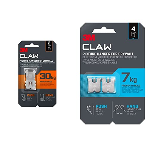 3M Claw Plasterboard Picture Hanging Wall Hooks For Hanging Home Décor, 4 Hangers, Holds up to 11 kg & Claw Plasterboard Picture Hanging Wall Hooks For Hanging Home Décor, 2 Hangers, Holds up to 30 kg