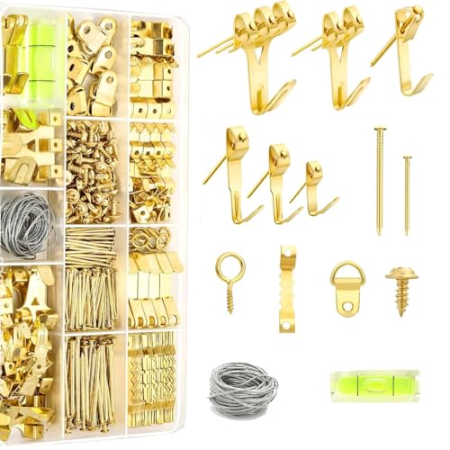 Wadakada 314 PCS Picture Hanging Kit Gold Metal Heavy Picture Hanging Hooks for Drywall, Picture Hooks with Nails,Hanging Wire Sawtoothetc