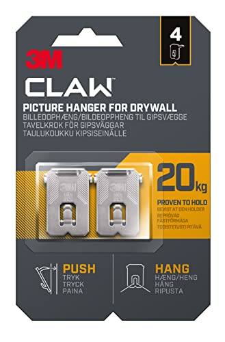 3M Claw Plasterboard Picture Hanging Wall Hooks For Hanging Home Décor, 4 Hangers, Holds up to 20 kg - Ideal for Heavyweight Items