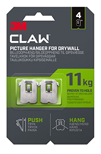 3M Claw Plasterboard Picture Hanging Wall Hooks For Hanging Home Décor, 4 Hangers, Holds up to 11 kg - Ideal for Heavyweight Items