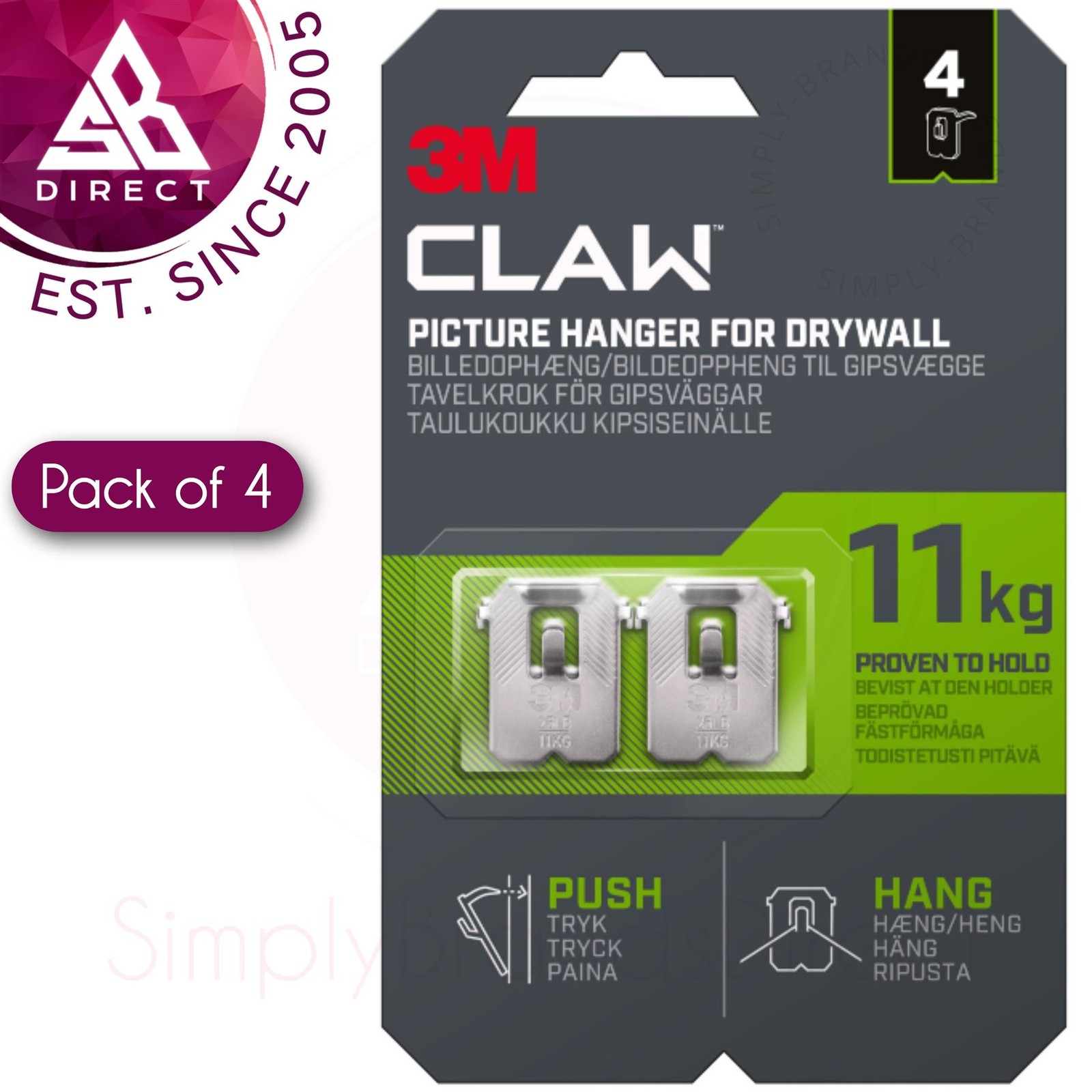 3M CLAW Drywall Plasterboard Picture Wall Hook Hanger Pack of 4 Holds Up To 11kg