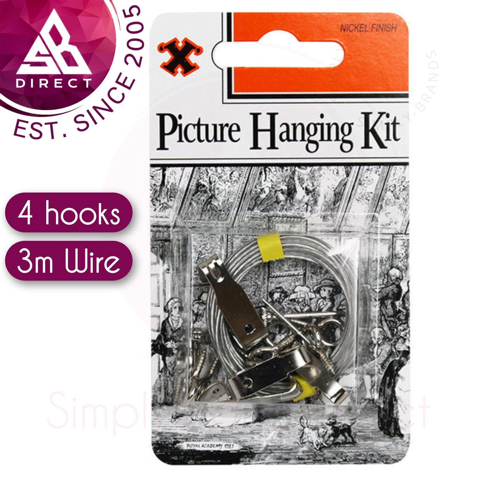 X Hooks Picture Hanging Kit│4 hooks/3m Wire Nickel Finish Plated, Blister Pack