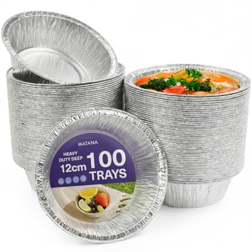 MATANA 100 Pack 5" Foil Pie Dishes - 12 cm / 250 ml Round Baking Trays for Tarts, Quiches, Desserts & Cakes – Reusable & Disposable Aluminium Pie Tins