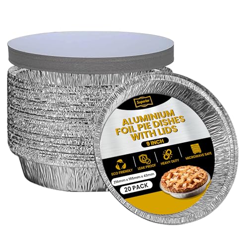 Superior Foil Pie Dishes 9 inch Round – Pack of 20 Foil Pie Cases with Lids – Durable Oven Freezer Safe Disposable Aluminum Foil Flan Dishes for Baking Storage Takeaway