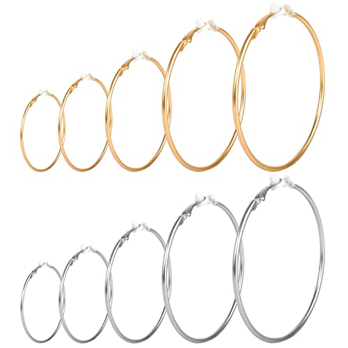 Anruyi 10 Pairs Clip On Hoop Earrings, Fake Earrings Hoops Multi Size Spring Hoop Earrings Non Pierced Earrings Lip Ear Clip for Women and Girls, Gold and Silver, 30-70MM
