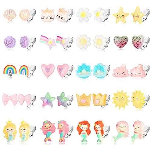 CASSIECA 20 Pairs Kids Clip On Earrings for Girls Toddler No Pierced Princess Play Earrings Dress Up Jewelry Set Cute Bling Mermaid Butterfly Rainbow Flower Heart Clips Birthday Christmas Gifts