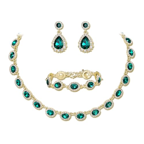 Clearine Weddding Costume Jewellery Set for Women Bridal Bridesmaids, Oval Crystal Collar Statement Necklace Teardrop Pierced Dangle Earrings Link Bracelet Set for Prom Party Emerald Green Gold-Tone