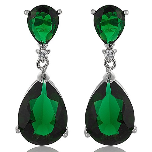 [RIZILIA CELEBOX] Teardrop Dangle Pierced Earrings with Pear Cut Gemstones CZ [Green Emerald] in 18K White Gold Plated, Celebrity inspired by Angelina Jolie
