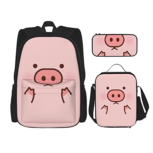 IUBBKI School Backpack Sets 3 Piece Boys Teens (Piggy Cute Pig Cartoon Patterned Pink) Book Bag+Lunch Bag+Pencil Case Cute Sackpack College Work Gym Hiking Fishing Carry On Bag