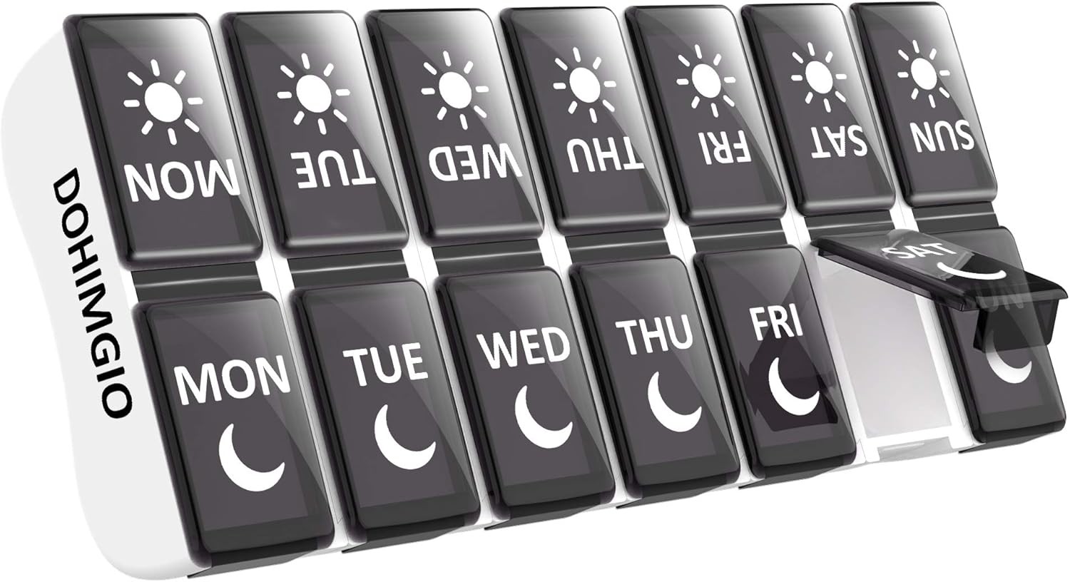 Pill Boxes 7 Day 2 Times a Day, Easy Fill Push Button Weekly Black and White